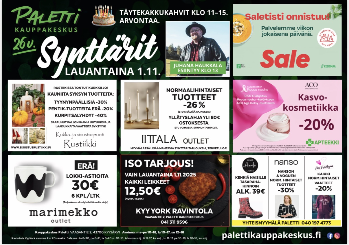 Lämpimästi tervetuloa Kauppakeskus Palettiin viettämään synttäreitä. Sale palvelee klo 10 alkaen ja kauppaliikkeet ovat Pyhäinpäivänä avoinna klo 11-17.